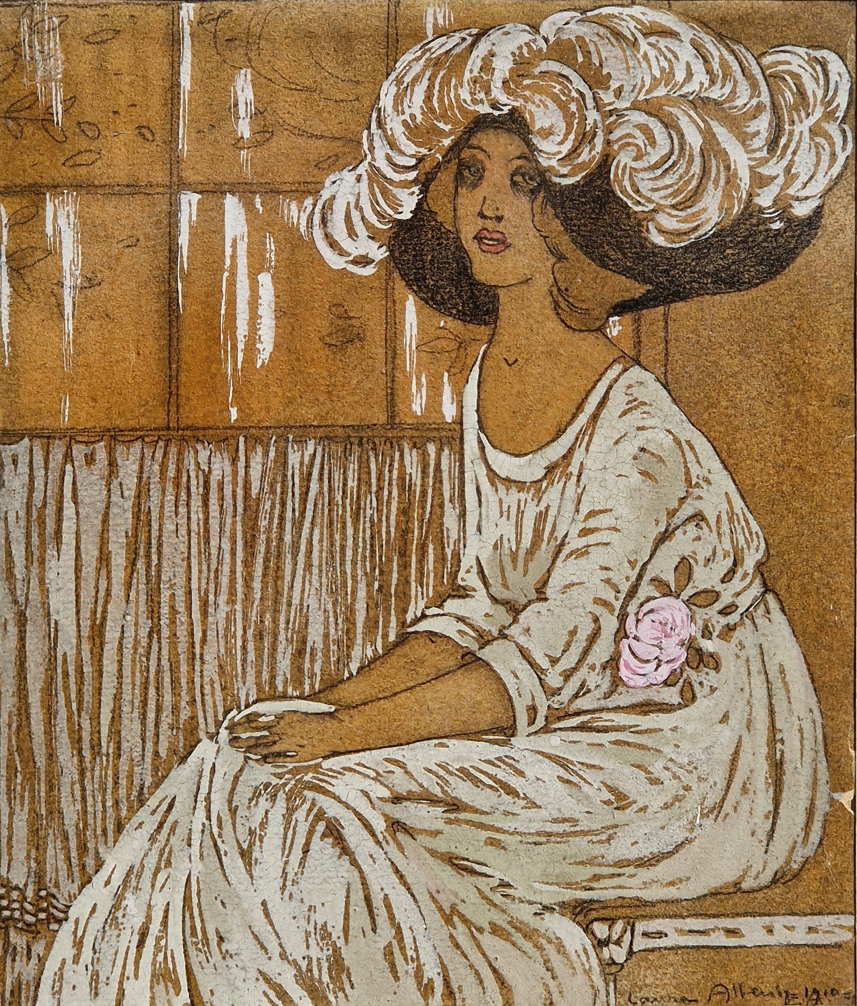 Aquesta elegant composició presenta una figura femenina asseguda, vestida amb un vestit vaporós i coronada per un espectacular barret de plomes. L’obra destaca pel refinament del traç i per l’ús delicat del guaix, que permet crear textures subtils i una notable sensació de volum, així com per la sensibilitat amb què es retrata la model. L’estil revela la influència del modernisme parisenc i de la moda contemporània, i incorpora una marcada dimensió decorativa i femenina.