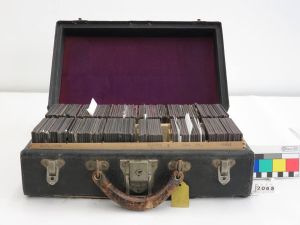 Les diapositives, positives en blanc i negre sobre vidre amb emulsió fotosensible, s’inscriuen en la tradició de la llanterna màgica i van ser habituals durant el primer terç del segle XX, abans de ser desplaçades per les diapositives de 35 mm. Estan constituïdes per dues plaques de vidre, un paspartú de paper i una cinta adhesiva perimetral, i algunes presenten acoloriment manual, així com etiquetes identificatives impreses o manuscrites.
